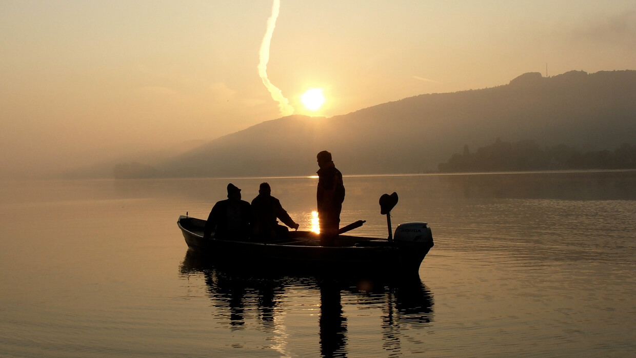 Wenn die Gäste des Hotel Hirschen auf der Halbinsel Höri schon vor Sonnenaufgang aufstehen, hat dies einen ganz besonderen Grund: Alle sitzen in zwei Fischerbooten mitten auf dem See, zusammen mit Fischer Martin Dietrich und seinem Team – die übrigens heute nur den Gästen zuliebe so "spät" die Netze einholen ...