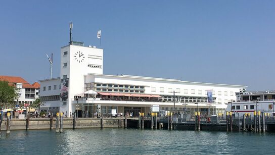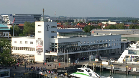 Heftig schallend knallt die Gischt gegen den Katamaran. Souverän und schnittig dreht er im Hafenbecken von Friedrichshafen. Sicher am Anleger angedockt, liegt er nun vor dem gravitätischen Hafenbahnhof. Was für ein kantiger Koloss, den der Stuttgarter Baurat Karl Hagenmayer so ausnehmend modern aus weißen Kuben mit langen Fensterbändern samt ausladendem Restaurantbalkon im Obergeschoss konzipierte. So viel Innovation hätte ich einem Baubeamten eigentlich gar nicht zugetraut, Chapeau ! Sorgsam unter dem Putz verborgen wurde die fortschrittliche Stahlskelettkonstruktion mit leichten Hohlsteinen als Füllmaterial. Wie ein Fingerzeig zum Schweizer Ufer vis-à-vis wirkt der seitlich in den breit gelagerten Hauptbau eingeschnittene Uhrenturm.