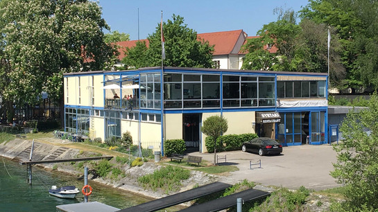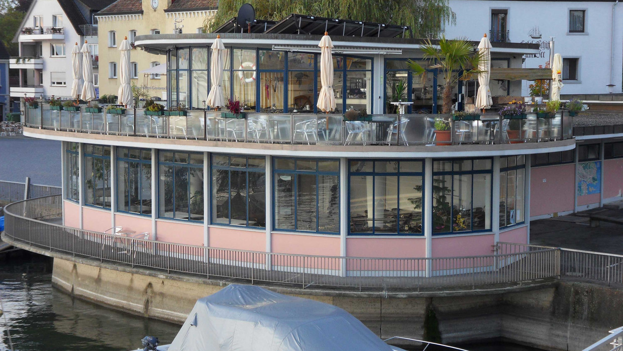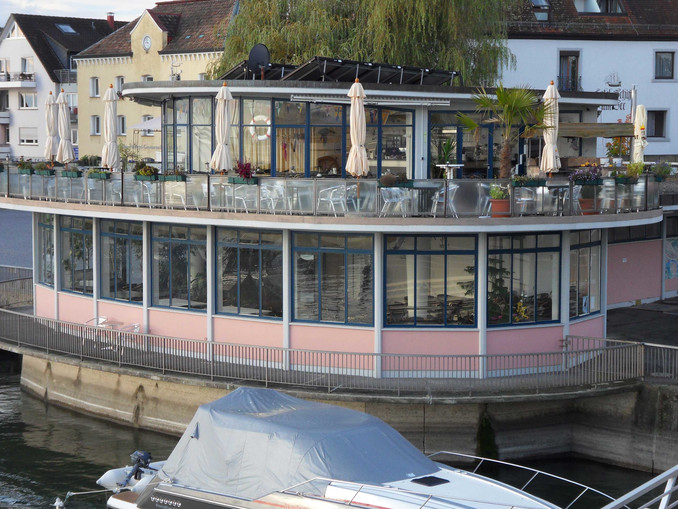 Heftiger spüre ich die Wellenschläge bei der Weiterfahrt mit dem Boot in den Konstanzer Trichter. Im Konstanzer Fährhafen strecken sich mir verglaste Wartepavillons wie Schiffsbrücken entgegen. Geradezu schwerelos wirken die runden Caféhäuser mit ihren überstehenden Flachdächern, Aussichtsterrassen und dünnen Stützen. Innen setzen Pilzsäulen, kreisende Geländer, gebogene Treppenläufe die schwungvolle Eleganz fort. Von graublauen Stahl- und Aluminiumprofilen gerahmte Fensteröffnungen lassen den Übergang zwischen Wasser und Land nahtlos erscheinen. Ab 1951 realisiert, gehören die Ländebauten zu den frühesten der Moderne im Nachkriegsdeutschland. Sie zeigen, wie technoide, multifunktionale Kleinbauten auf sinnfällige Weise zu einer erquicklichen Ausdrucksarchitektur aufgewertet werden können. Die Nähe zum Bauhaus kommt nicht von ungefähr: Der Architekt Hermann Blomeier hatte von 1930 bis 1932 am Dessauer Bauhaus bei Mies van der Rohe studiert. Seit 1933 in Konstanz ansässig, prägen seine Gebäude in der Bauhaus-Nachfolge bis heute das Stadtbild. Direkt gegenüber der Altstadt am Seerhein lege ich an. Hier steht Blomeiners 1956 eröffnetes, gitterhaftes, scharfkantiges Vereinsheim für den Ruderclubs Neptun. Mit den ausgreifenden Streben des graublauen Stahlskeletts gelang ihm ein graziles Spiel offener und geschlossener Volumina.