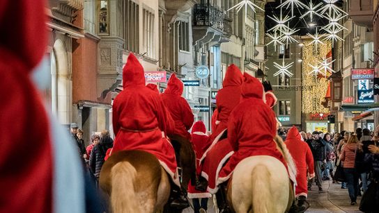 Mich aber führt an diesem Tag etwas ganz anderes nach St.Gallen. Ich warte auf einen Mann. Aber nicht auf irgendeinen, sondern auf einen etwas dicklichen, älteren Herren, mit weißem Bart und roter Mütze. Heute ist der 6. Dezember, in St.Gallen heißt das: Zeit für den traditionellen Chlausritt! Ich stehe am Multertor, wo gleich Samichlaus – wie der Nikolaus hier in der Schweiz genannt wird – seine alljährliche Tour durch die Altstadt starten soll. Neben mir Kinder, vor mir Kinder, überall aufgeregte Kinder. Das steckt an, denn für den Weihnachtsmann ist man ja nie wirklich zu alt, oder? Als Samichlaus um die Ecke biegt, tut er das dann nicht alleine, sondern gleich in vielfacher Ausführung, mal auf dem Pferd, mal zu Fuß, mal in der Kutsche, mal ein Pony an der Leine führend, in Begleitung von wuselnden Sternchen und Engelchen. Welcher ist denn nun der richtige? Egal, die Kinder scheint das auch nicht zu interessieren, solange sie eine Leckerei aus den zahlreichen Chlaus-Sackerln abstauben können. Seinen strengen Freund mit der Rute, den Schmutzli (unseren Knecht Ruprecht) zähle ich hingegen nur einmal, aber das ist ja auch besser so…