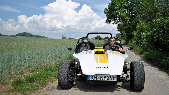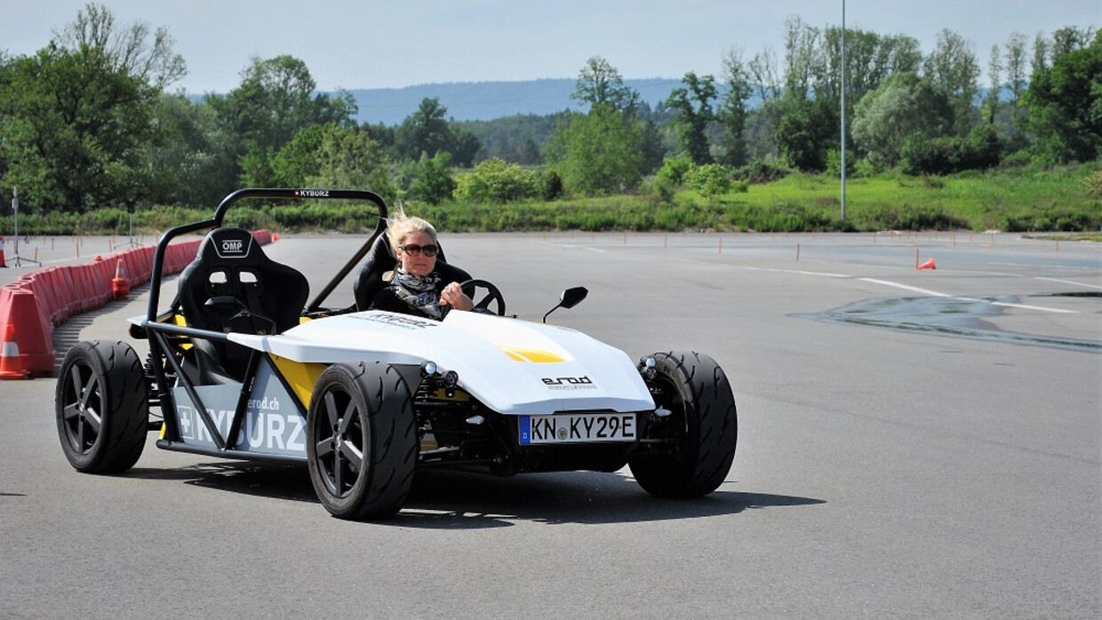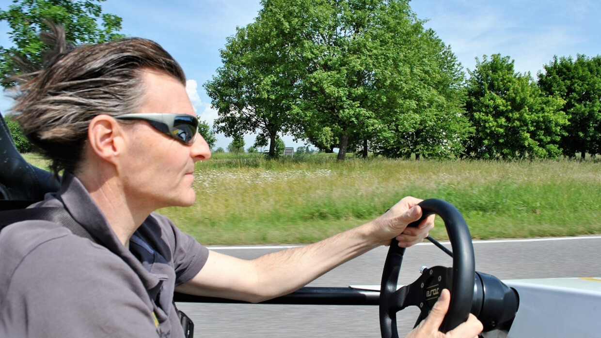 Gurt und Schutzbrille sitzen – die Handbremse ist gelöst, der rechte Fuß tippt das Gaspedal an und los geht’s – quasi in knapp vier Sekunden von null auf 100 Kilometer pro Stunde. Auf der Teststrecke des Fahrdynamikzentrums schießt das knapp 600 Kilogramm schwere Fahrzeug davon – der Schub hat es in sich und Rogowski hat Recht, wenn er sagt: „Es ist ein bisschen wie Achterbahn fahren“. Zu kurz ist die Gerade, um auf die maximale Geschwindigkeit von etwas über 110 Kilometer pro Stunde zu kommen, aber es kitzelt ganz schön im Bauch.