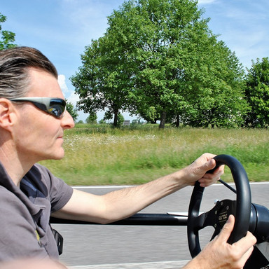 Dann fahren wir auch schon auf die Landstraße. Der Zweisitzer rollt fast geräuschlos vom Gelände. Automatisch drückt der Fuß aufs Gas - Bäume, Hecken, Wiesen und Felder fliegen nur so vorbei, die beiden Störche im hohen Gras sehen wir nur aus den Augenwinkeln. Unser Flitzer klemmt zwischen einem Geländewagen und einem Laster und erscheint im Größenvergleich winzig – fast ungeschützt, denn Kotflügel und Knautschzone fehlen. Aber auch zu den Fahrern in den Kleinwägen müssen wir hochschauen und ernten erstaunte Blicke. Die Ampel schaltet auf grün und der Fahrtwind verheißt wieder ein Gefühl von Schwerelosigkeit, auch wenn die Räder sicher aufliegen. Den Entwicklern des Elektrokarts mit Straßenzulassung, darunter auch Studenten der Fachhochschule Bern, ging es genau um dieses pure Fahrerlebnis.