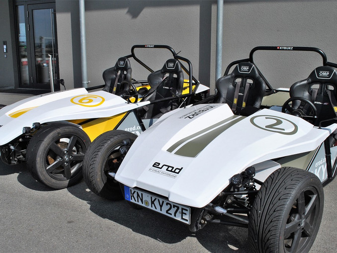 Eine Tür zum Einsteigen gibt es beim offenen Roadster nicht – wir steigen über die obere Stange des Rohrrahmens und nehmen und auf dem Fahrer- und Beifahrersitz Platz. Der leichte Elektrosportwagen ist eher puristisch ausgestattet. Es gibt weder elektronische Assistenz-Systeme noch Servolenkung und natürlich auch keinen Bremskraftverstärker. „Ab der ersten Sekunde ist das volle Drehmoment da“, verspricht Simon Rogowski bei kurzen Einführung.