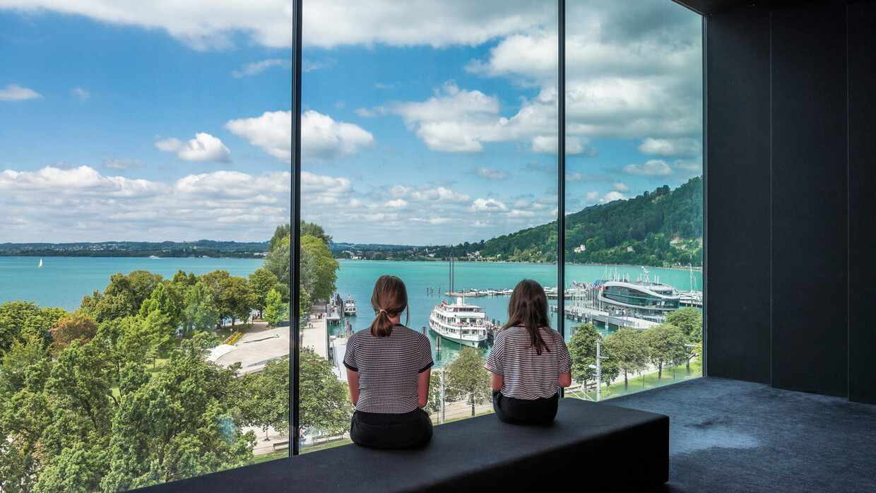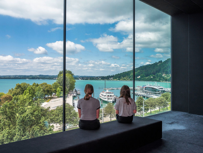 Die Türe im vierten Stock des vorarlberg museums versteckt sich ein bisschen. Notfalls frag‘ nach ihr. Reingehen lohnt sich: Du findest dich in einem schwarz ausgekleideten Raum mit einer Sitzbank im Zentrum. Vor dir ein riesiges Fenster mit Blick auf den Bregenzer Hafen und den Bodensee. Du siehst, dass unten munteres Leben herrscht. Doch du hörst nichts. Im Raum ist es ganz still und du hast alle Zeit der Welt, die Szenerie am See zu betrachten.