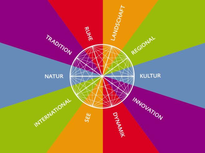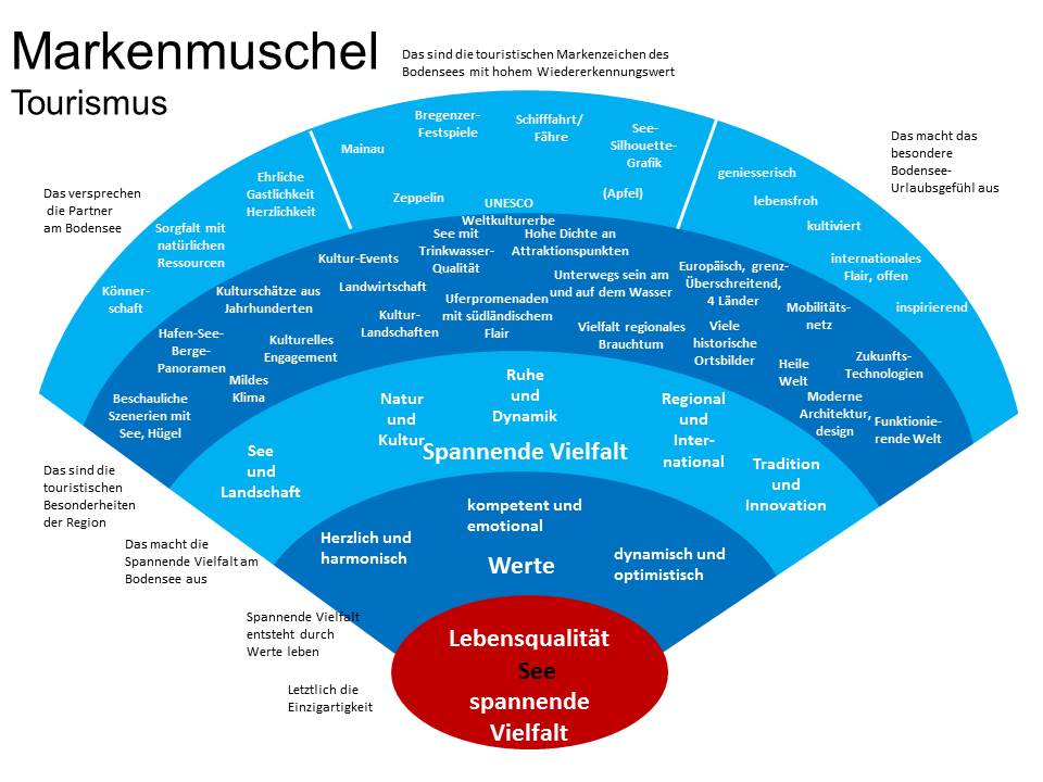 Der Markenkern der Vierländerregion Bodensee basiert auf dem Dualitätsprinzip „spannende Vielfalt“ und der facettenreichen Lebensqualität. Diese spannende Vielfalt der Region entsteht durch das Leben der Werte. Die Werte herzlich und harmonisch, kompetent und emotional, dynamisch und optimistisch finden sich in der Markenmuschel wider. Die wesentlichen Markeninhalte der Bodenseeregion und das vielfältige touristische Angebot ergeben die Markenmuschel.