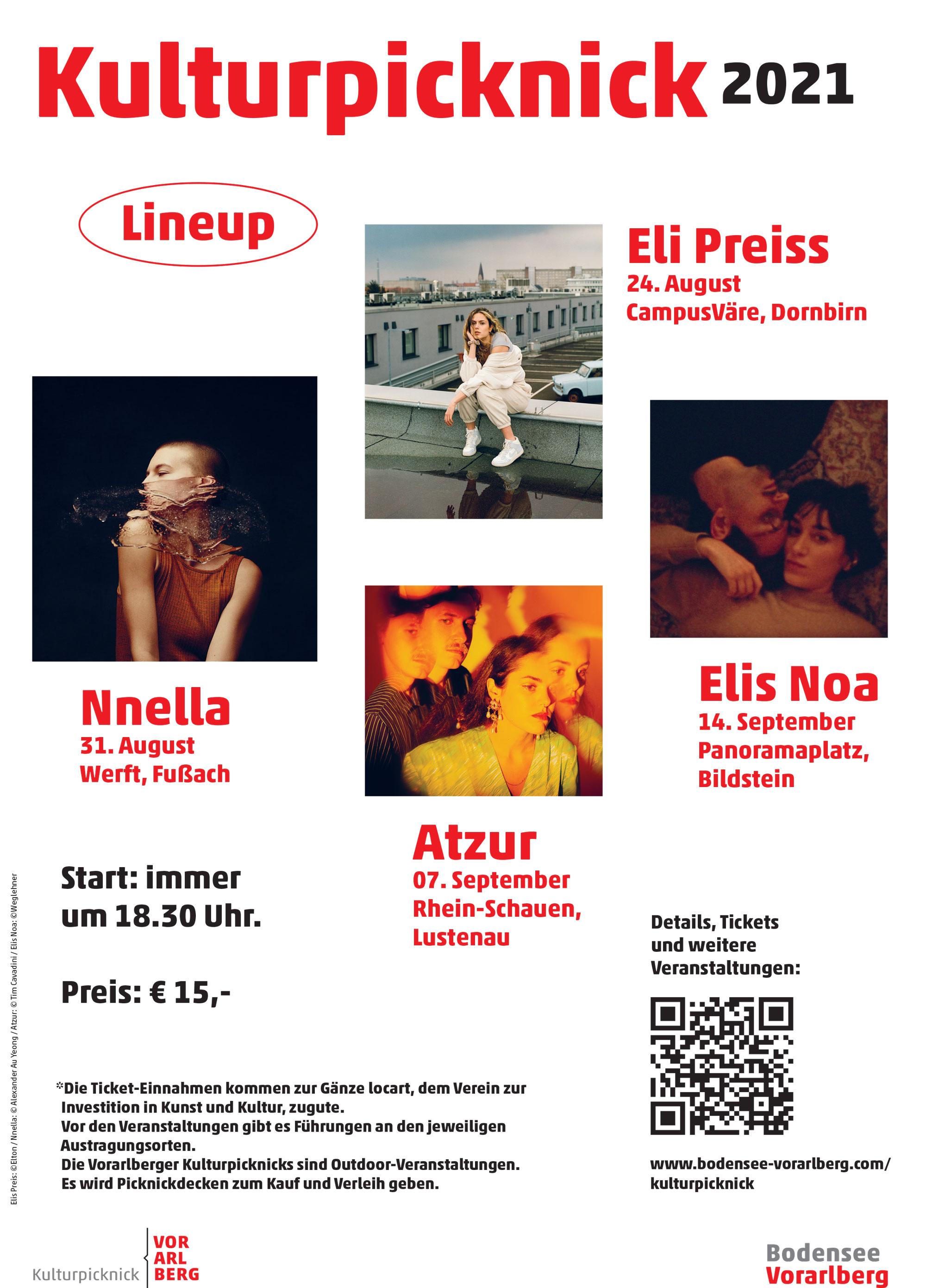 Nach der ausverkauften Erstauflage veranstaltet Bodensee-Vorarlberg Tourismus auch heuer Vorarlberger Kulturpicknicks. An besonderen Orten im Land bieten sie jungen österreichischen MusikerInnen eine Bühne: den Singer-Songwriterinnen Eli Preiss und Nnella, der Band Atzur und dem Electronic-Soul-Duo Elis Noa. Die Erlöse kommen dem kunstfördernden Verein Locart zugute. Für die Verpflegung sorgen regionale Betriebe. Der Verkehrsverein Hohenems und das Hotel Schwärzler laden ebenso zu Vorarlberger Kulturpicknicks.