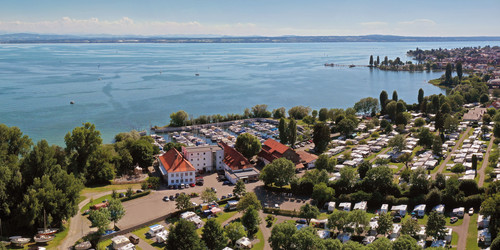 Großzügige Stellplätze für Wohnwagen und Reisemobile, geräumige und moderne Sanitäranlagen, Liegewiese direkt am Strand, Apartments, Yachthafen, Restaurant, „Lädele“, Spielplatz
