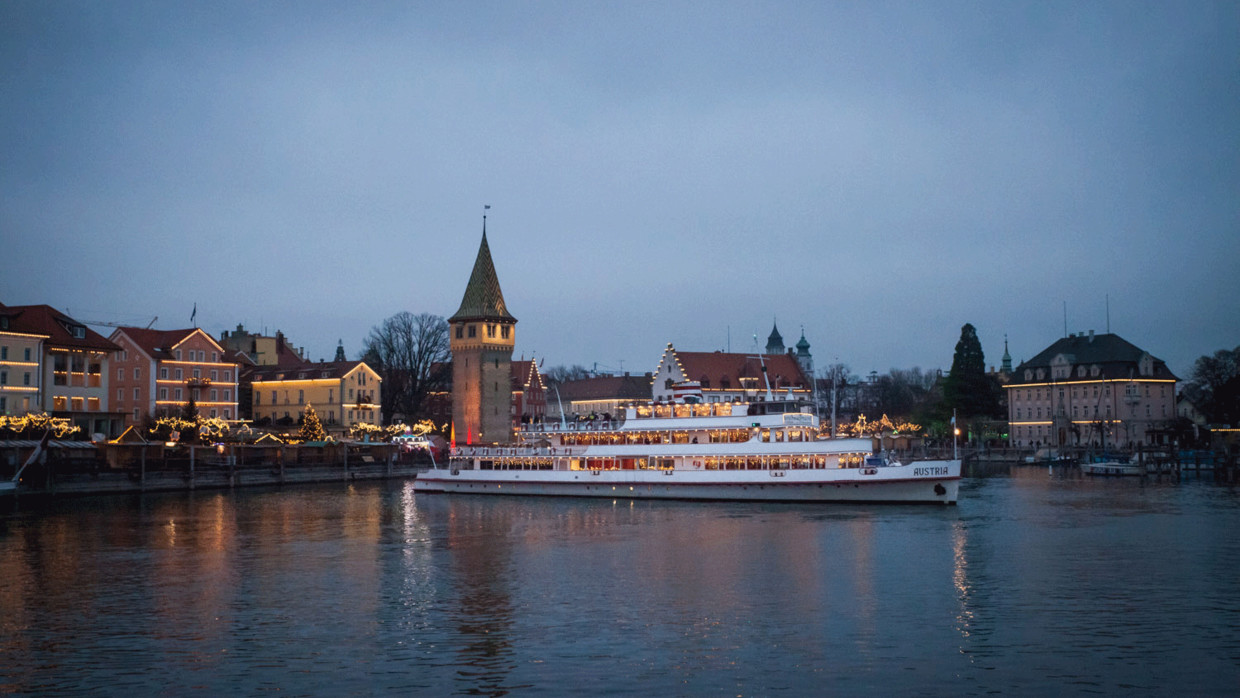 Genießen Sie gleich mehrere Weihnachtsmärkte an einem Tag - und das in zwei Ländern. Bevor Sie an Bord des behaglich beheizten Weihnachtsschiffes kommen, bietet sich ein Besuch der Bregenzer Weihnachtsmärkte - am Kornmarktplatz und in der Oberstadt* - an. Auf dem MS «Austria» gibt es eine Krippenausstellung, eine Modelleisenbahn und einen Winterwald zu entdecken sowie eine Bar am Außendeck.