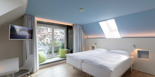 Mitten im Klosterviertel, in der Nähe vom Bahnhof, liegt das Hotel Dom ruhig und gleichzeitig zentral. Es ist der ideale Ausgangspunkt, um St. Gallen und die Umgebung zu erkunden: die Altstadt mit Kathedrale und Stiftsbibliothek, die Olma Messe, die Universität, den Bodensee, das Appenzellerland. Von aussen präsentiert sich das Gebäude nüchtern und eigenständig, innen farbenfroh, warm und herzlich – genau wie die Angestellten. Das Hotel Dom ist ein spezieller Ort für spezielle Menschen. Hier finden rund 55 Personen mit einem erhöhten Unterstützungsbedarf einen Ausbildungs- oder Arbeitsplatz: in der Gastronomie, an der Réception oder im Hausdienst. Sie alle engagieren sich jeden Tag für unsere Gäste, damit diese ihren Aufenthalt in vollen Zügen geniessen können.