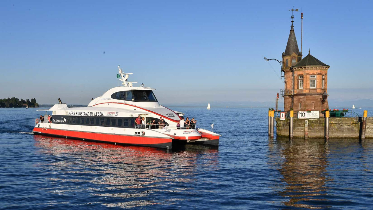 Auf nach Übersee – in 52 Min. von Konstanz nach Friedrichshafen. Der Katamaran legt stündlich in den Innenstädten von Friedrichshafen und Konstanz ab und bringt seine Fahrgäste in Windeseile über den Bodensee – entspannt mit Bistro an Bord.
