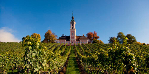Hoch über dem See und inmitten malerischer Weinberge erhebt sich der rosa-weiße, schlanke Turm der prunkvollen Barockkirche Birnau. Schon auf der Aussichtsplattform vor der Kirche ahnt man, warum sich dieser Ort zu einem der beliebtesten Ausflugsmagneten für Touristen und Heiratswillige entwickelt hat. Beim Gang durch die Pforten des Gotteshauses taucht der Besucher dann gänzlich in eine andere, von barocker Fülle und religiöser Andacht erfüllte Welt. Die sprühenden Verzierungen und Engelsfiguren des Bildhauers Joseph Anton Feuchtmayer und die bravoureusen Deckengemälde des Malers Gottfried Bernhard Göz verleihen der 1750 errichteten und Maria geweihten Kirche eine festliche Pracht, die der Birnau nicht umsonst den Rang der schönsten Barockkirche in der Region einräumt. Bis heute ist sie ein von den Zisterziensern betreutes, „arbeitendes“ Kloster und ein Wallfahrtsort, der jedes Jahr viele Gläubige anzieht. Das Uhrwerk, das die vier Turmuhren in alle Himmelsrichtungen und drei in der Kirche angebrachte Uhren betreibt, ist das älteste funktionierende Uhrwerk Deutschlands.