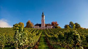 Hoch über dem See und inmitten malerischer Weinberge erhebt sich der rosa-weiße, schlanke Turm der prunkvollen Barockkirche Birnau. Schon auf der Aussichtsplattform vor der Kirche ahnt man, warum...