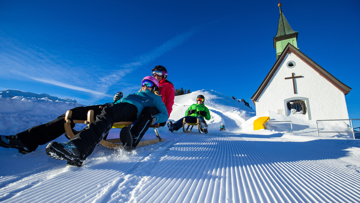 The longest toboggan run in Eastern Switzerland awaits you! At around 7 kilometers long, the toboggan run from the summit back to the valley station is not only the longest in Eastern Switzerland. It is also one of the most exciting and panoramic. You can easily reach the starting point at the summit cross by cable car. We prepare the toboggan run fresh for you every day. The route leads via Scheidegg, Chlepfhütten, Roos and back to the Jakobsbad valley station. There are some very challenging sections, which is why we do not recommend the toboggan run for children. The difference in altitude is 772 meters.