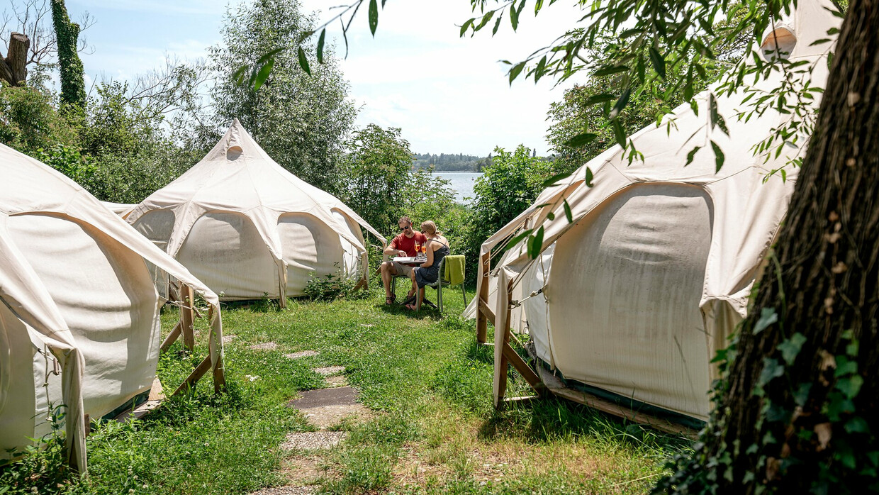 Der Naturcampingplatz Litzelstetten-Mainau, direkt am Bodensee mit Blick auf die Insel Mainau | © MTK / Leo Leister