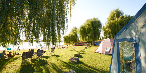 Idyllically situated campsite in the Markelfinger Winkel with a shallow bathing beach, direct railway connection, playground, restaurant, large tent pitch and accommodation for cyclists.