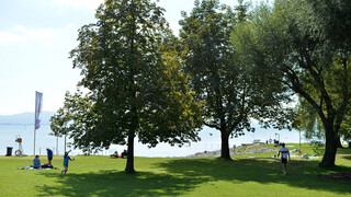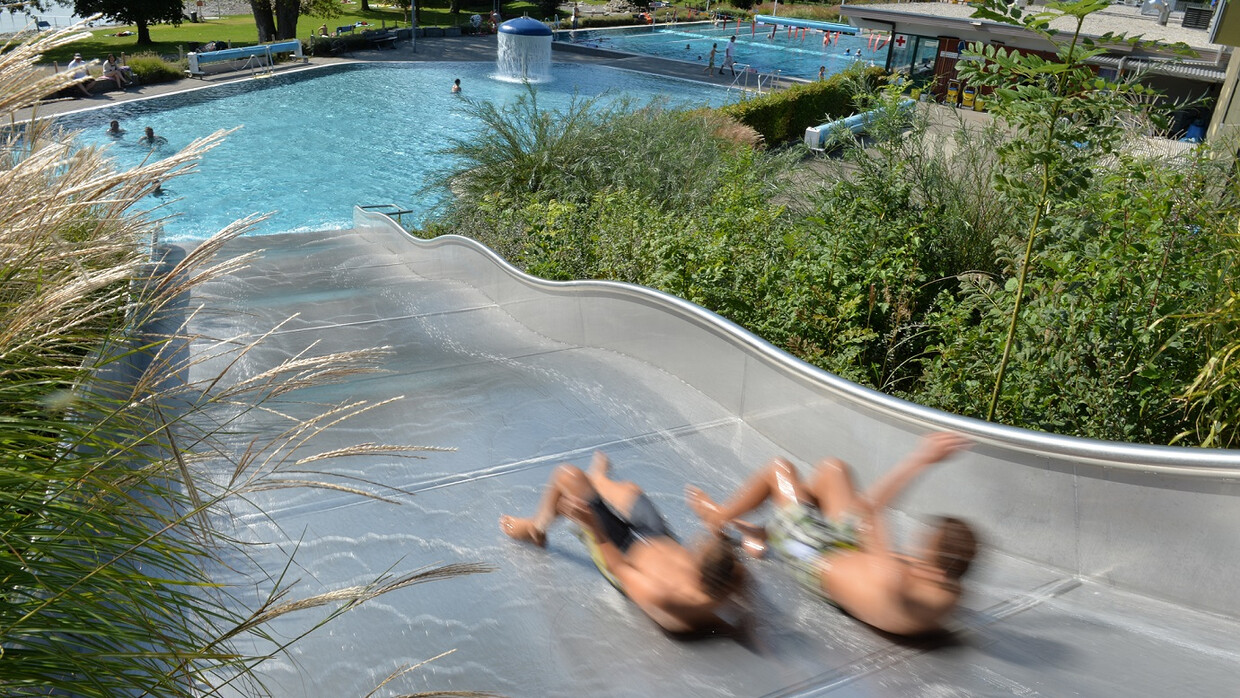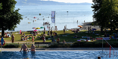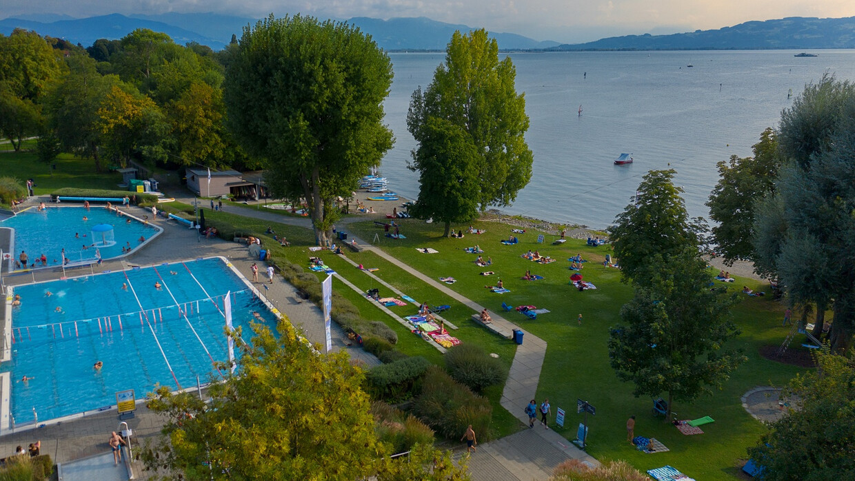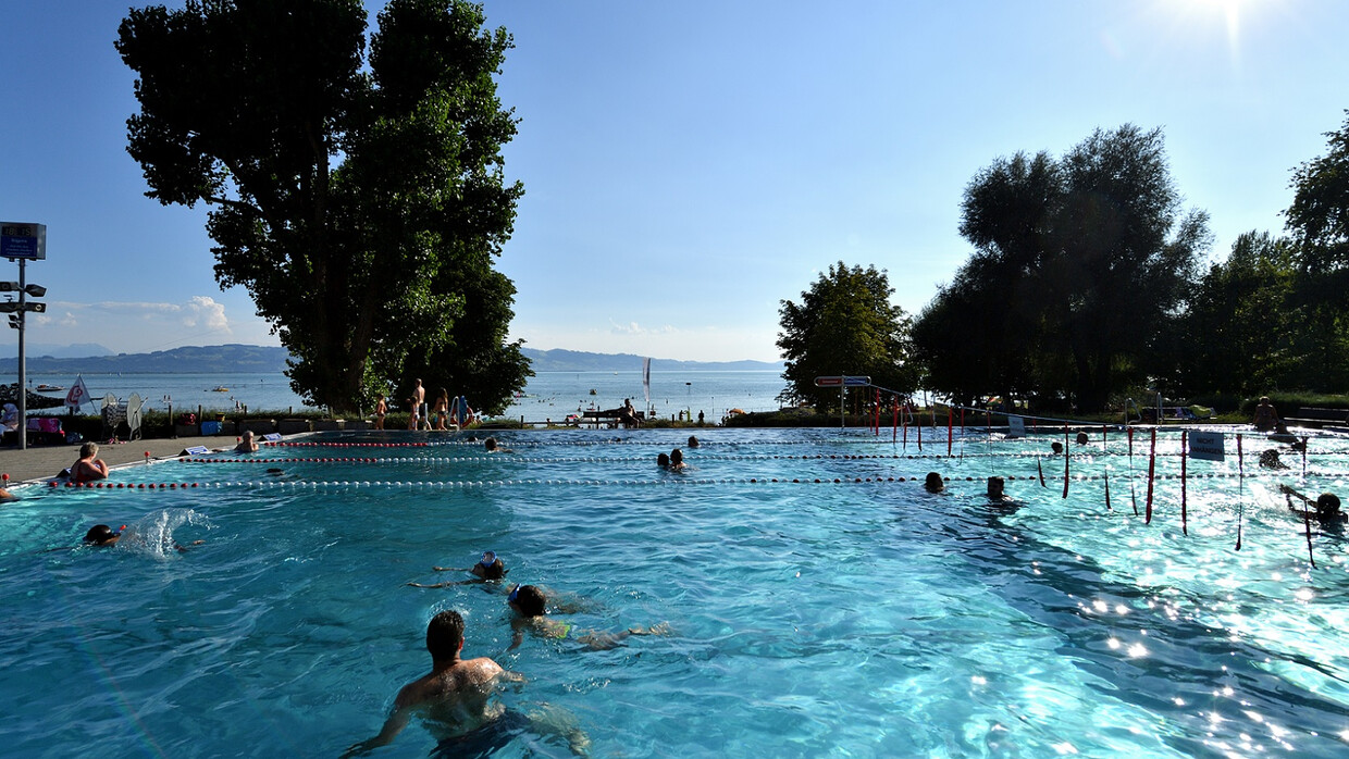 La piscina riscaldata (28°) direttamente sulla sponda del Bodensee, con vista spettacolare sul lago e sulle montagne di fronte, è sinonimo di divertimento in acqua anche nelle giornate più fresche. Nella vasca per bambini e ragazzi si trova uno scivolo lungo 15 metri, e nell’area bimbi “Augustins Kinderland“, dove scivolare sulla pancia con le gomme ad acqua, ci sono fontane, altalene e amache per giocare e scatenarsi. Ed è bello trascorrere in relax una giornata d’estate sulla banchina sul lago o nel grande prato verde. Altre possibilità: scuola di surf, nuoto o immersioni